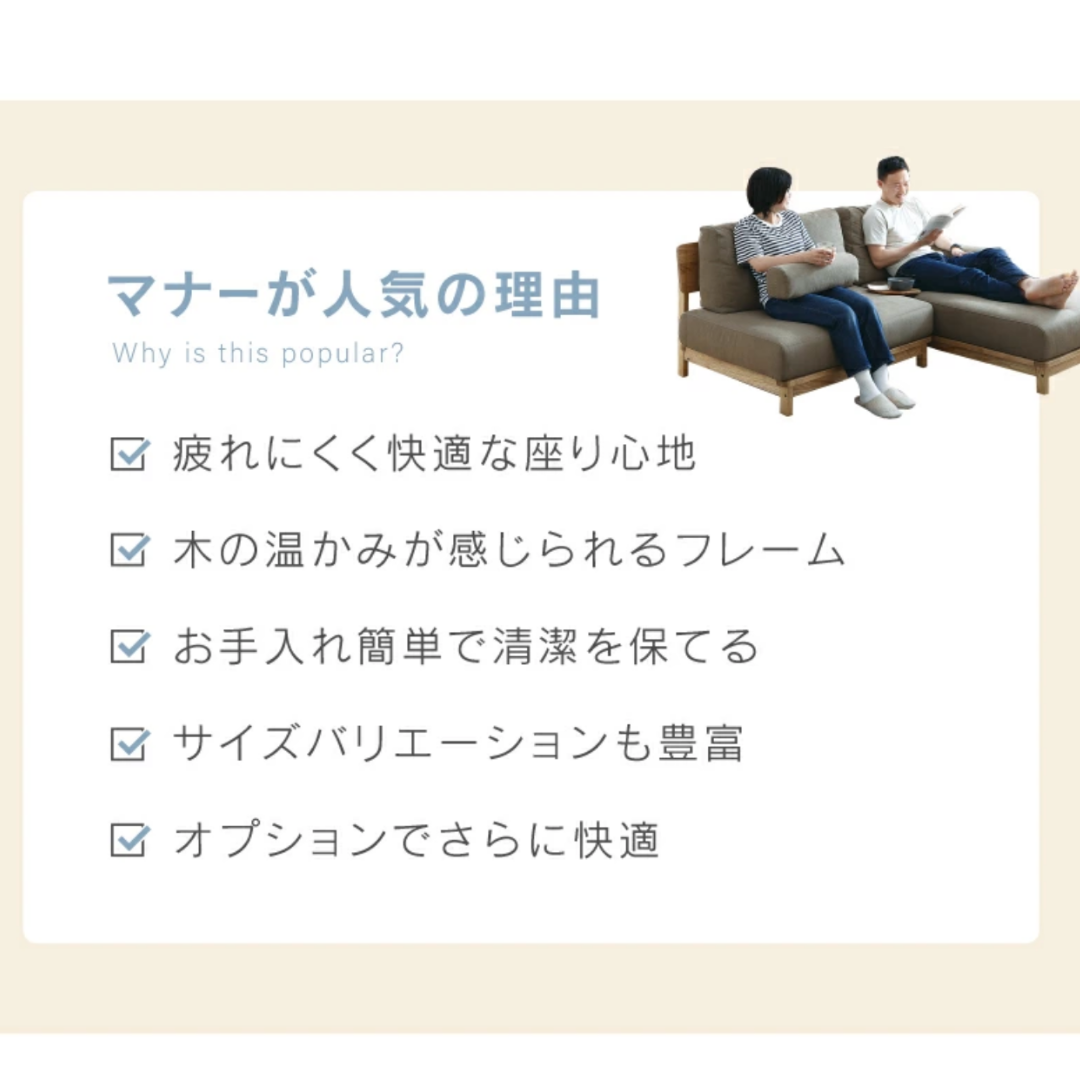 ナチュラルテイストで細部までこだわったソファー、マナーにはいいところがたくさん!