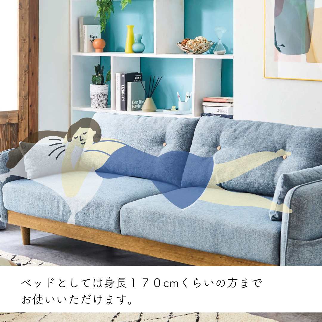 ソファーとしても、ベッドとしても、170cmくらいの方までゆったりと寝られるサイズ感。