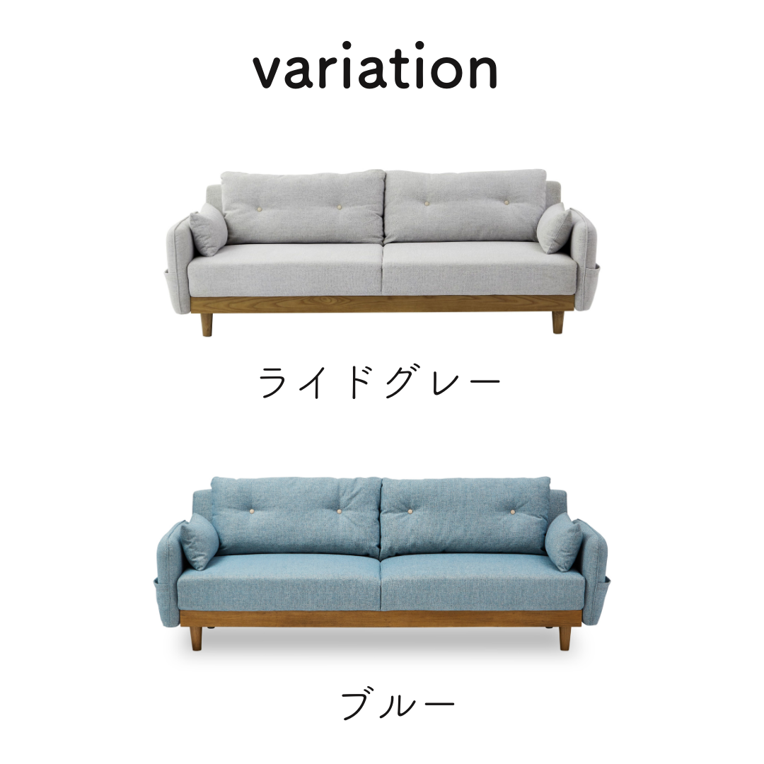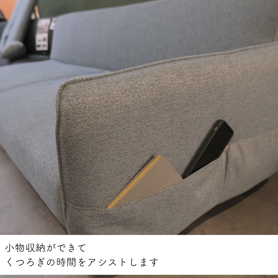 両サイドには便利なポケットがあり、リモコンやスマートフォン、雑誌などを収納できます。