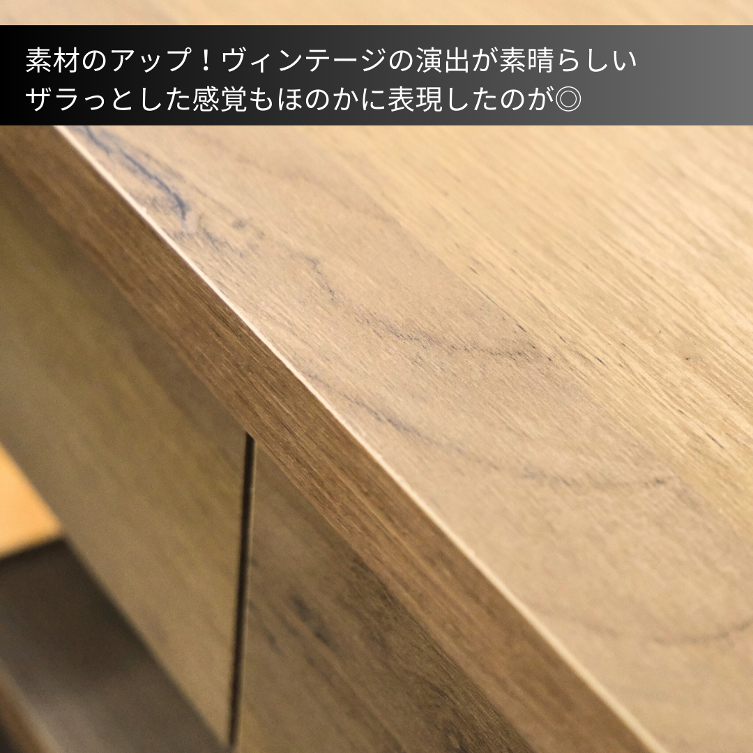 まるでヴィンテージ家具のような趣がありながら、チープさを感じさせない奥行きのある立体感あるデザインと造り込み。