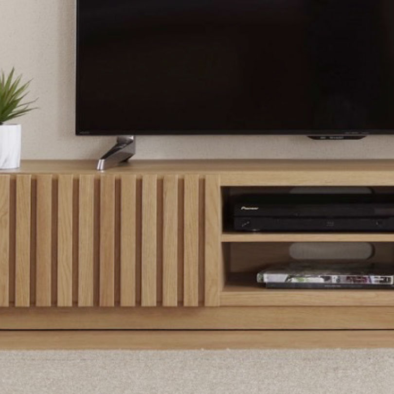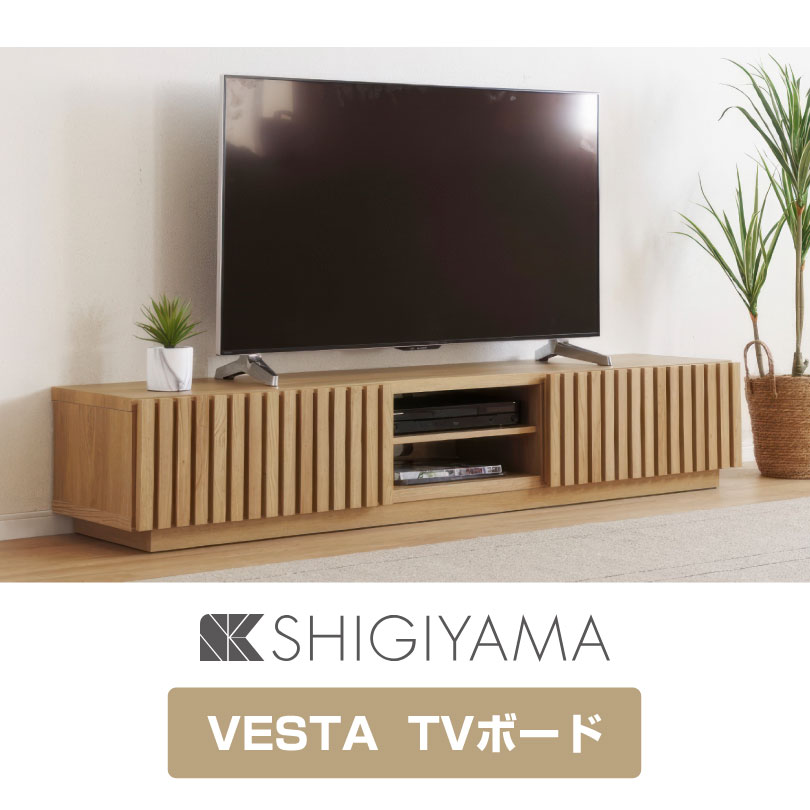 ナチュラルな木目と縦格子のデザインが目を引くシギヤマ家具の「VESTA(ヴェスタ)」は見た目も収納力もバッチリのテレビボード。